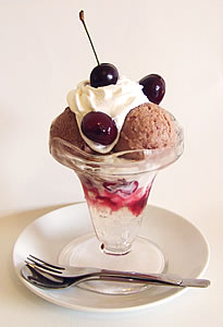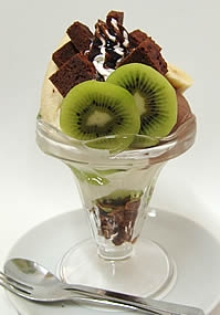 6月のパフェ 緑あざやかな川内村の山々を、さわやかなスィーツにしてみました。パフェは全体の味バランスがポイント。バニラアイス、メロンシャーベット、ババロアと、最後までおいしく召し上がれます。 |